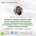 26/04/23-15hs: “Estudio de la respuesta frente a estrés biótico y abiotico de Glycine max (soja) tratada con microorganismos promotores del crecimiento vegetal y su utilización en la búsqueda de nuevos aislados”. Ing. Agr. Pamela Barengo.