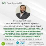 22/11/23-15hs: “Acciones de internacionalización para la mejora de los procesos de enseñanza – aprendizaje en la sustentabilidad de los sistemas productivos agropecuarios”. Willian Bucker Moraes.