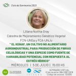 06/07/23-15hs: “El Kenaf, un cultivo no alimentario agroindustrial para producción de fibras celulósicas y una especie como fuente de variabilidad potencial con respuesta al estrés hídrico”. Dra. Ing. Liliana Norma Gray.