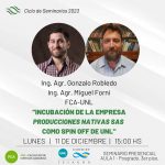11/12/23-15hs: “Incubación d ela empresa Producciones nativas SAS como spin off de UNL”. Ig.Agr. Miguenl Foni, Ing. Agr. Gonzalo Robledo.