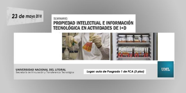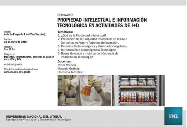 Seminario de Propiedad Intelectual e información tecnológica en actividades de I+D. Dirigido a: docentes, investigadores, personal de gestión de la Facultad de Ciencias Agrarias y Ciencias Veterinarias. La actividad es gratuita.