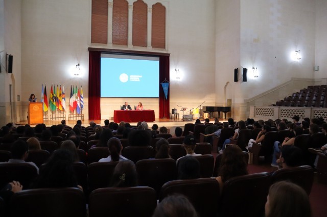 "Una bienvenida más como hacemos habitualmente, ya que todos los años tenemos dos inicios, uno en cada cuatrimestre. Este año estamos recibiendo alrededor de 76 estudiantes que vienen de 9 países distintos de latinoamerica y Europa: estamos recibiendo estudiantes de Brasil, Uruguay, Paraguay, Colombia, Mexico y de Italia, Francia, España y Alemania", explicó la vicerrectora Larisa Carrera. "Estamos muy contentos, siempre es un nuevo inicio y con muchas cosas preparadas para recibirlos y tratando de que la estancia aquí en la universidad sea la mejor experiencia posible. Tenemos todo un equipo de gente que trabaja preparando su llegada y a disposición para que no tengan ninguna dificultad en lo académico, trabajando en articulación con las unidades académicas y en lo social también, por eso tenemos un equipo de tutores internacionales formados que los acompañan en ese proceso de inmersión en la universidad", añadió.