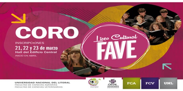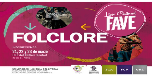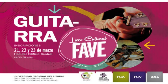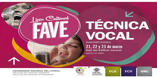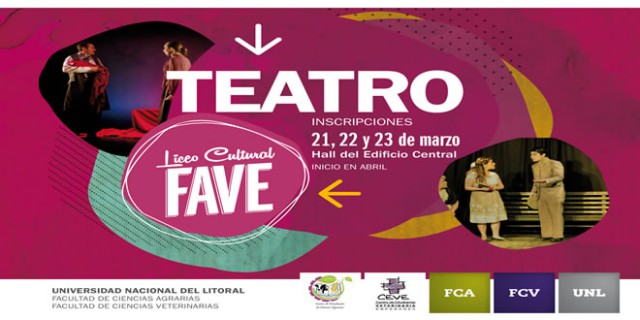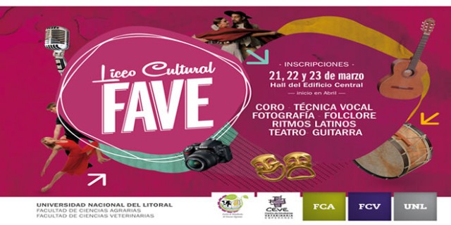 El 21, 22 y 23 de marzo inician las inscripciones a los talleres de teatro, danzas folclóricas, técnica vocal, coro, guitarra, fotografía y ritmos latinos que conforman el Liceo Cultural FAVE. Será en el Hall del Edificio Central de 10 a 14 hs. El 22 de marzo, a las 12 hs. se realizará una muestra de los talleres protagonizada por los alumnos.