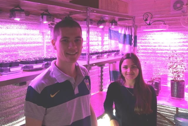 En la foto, Walter Cucit y Mélani Cúnico, dentro de la cámara de crecimiento de plantas cuando realizaban el ensayo.