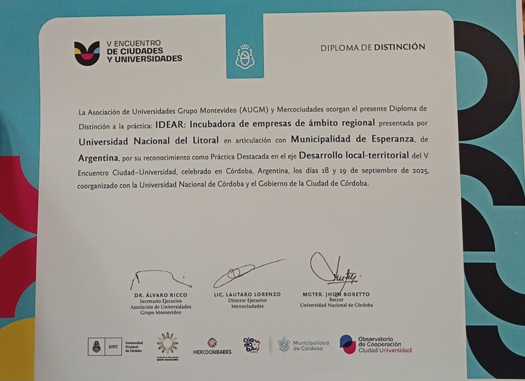 Integramos este espacio de diálogo, que fomenta la colaboración y fortalece el trabajo conjunto entre el mundo académico y los gobiernos locales. Asimismo, IDEAR: Incubadora de Empresas de Ámbito Regional, recibió un Diploma de Distinción por su reconocimiento como Práctica Destacada en el eje Desarrollo local-territorial.