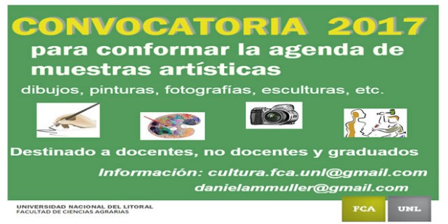 La Coordinación de Cultura de la Facultad de Ciencias Agrarias invita y convoca a docentes, no docentes, egresados y alumnos que desarrollen alguna expresión artística, como fotografía, dibujo, pintura, escultura, cerámica, etc., a proponer y diseñar muestras artísticas para ser realizadas durante el año 2017.
